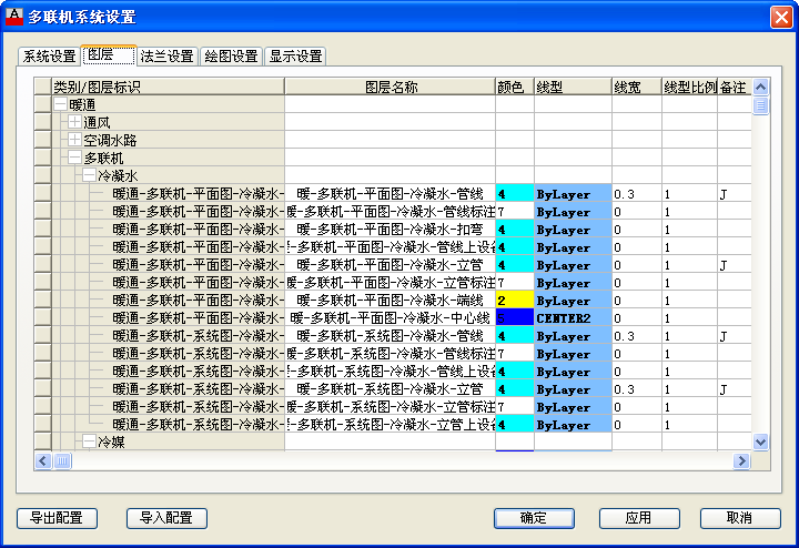 1、对各种类空调水路管线的图层名称、颜色、线型、线宽等参数进行设置、编辑。